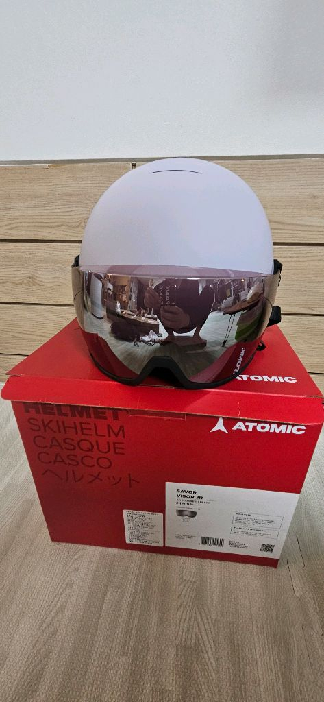 아토믹 사보어 주니어용 스키 헬멧과 바이저가 함께 있는 세트예요. 박스와 구성품 모두 깔끔한 상태이며, 아이 스키 입문용으로 딱 좋을 것 같아요!사이즈는 S입니다 기스없음