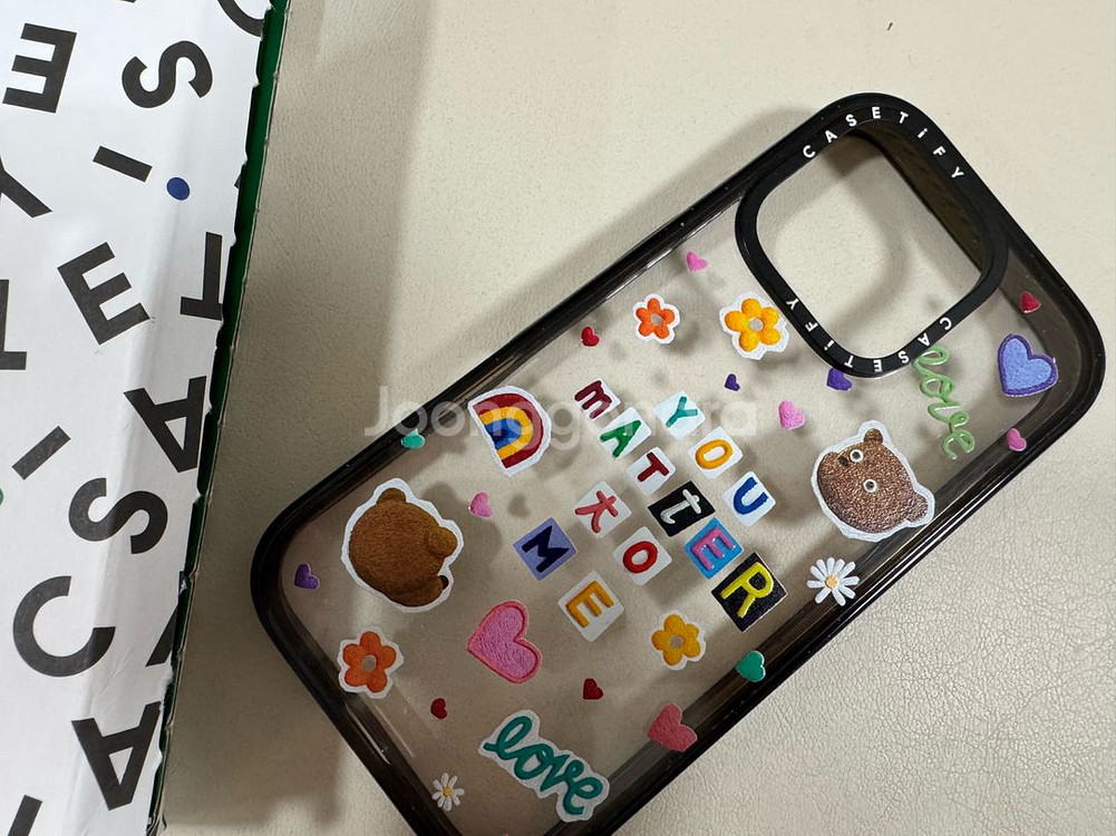 케이스티파이 아이폰16프로 맥세이프 호환 케이스예요. 귀여운 곰돌이와 하트 패턴들이 포인트이고, 상태 양호합니다!