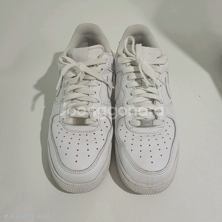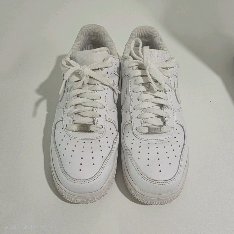깔끔한 화이트 컬러의 나이키 에어포스1 운동화예요. 전체적으로 상태가 양호해 보이고 착용감도 좋을 것 같아요. 클래식한 디자인으로 어떤 스타일에도 잘 어울릴 거예요!