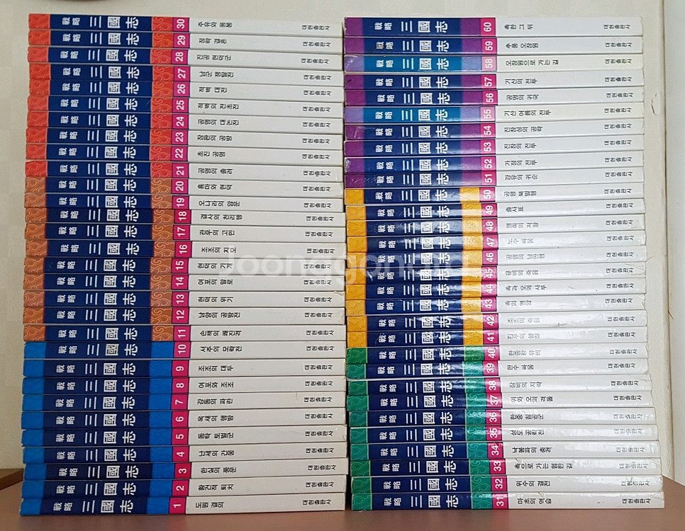 전략삼국지 컬라판 60권입니다 노출되는 부분은 변색이나 오염이 조금은 있습니다 내지는 낙서나 낙장 등 없이 상태 좋습니다. 택포금액입니다