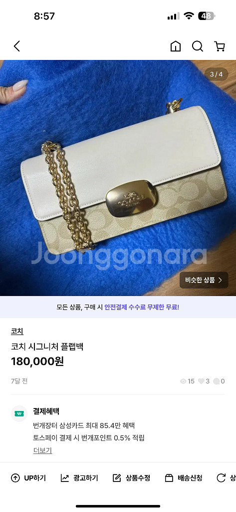 코치의 시그니처 패턴이 돋보이는 코지백이에요. 화이트 바탕에 골드 체인이 고급스럽고 실용적인 사이즈로 데일리용으로 딱 좋아요. 깔끔한 상태로 보관되어 있습니다.