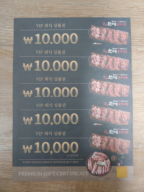 ▶채팅주세요 한마음 정육식당 VIP 외식 상품권 5만원권 유효기간 : ~ 2026.03.31까지 1만원권 5장입니다. 한마음 정육식당 전매장에서 사용가능 차액은 현금으로 반환 불가 5장씩 묶어서 팝니다. 10장 있어요 5장당 3만 6천원 택배시 3100원 추가 편의점 반값택배시 2천원 추가