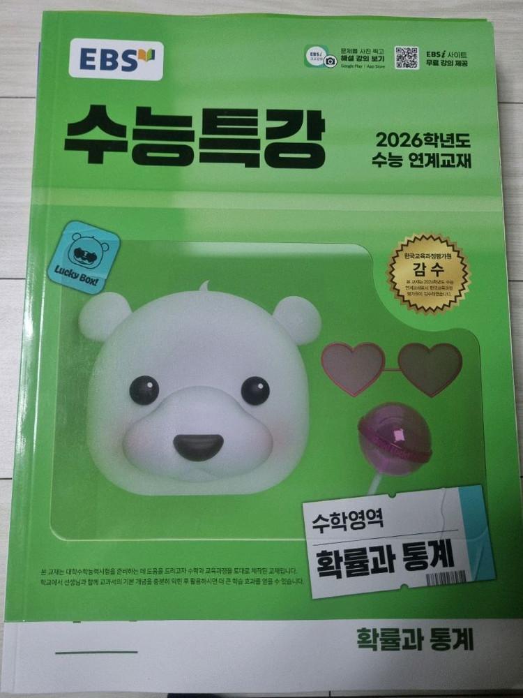 2026학년도 EBS 수능특강 확률과통계 교재입니다. 표지에 귀여운 곰돌이 캐릭터가 그려져 있고, 수능 준비용으로 좋은 교재예요. 어제받은새책