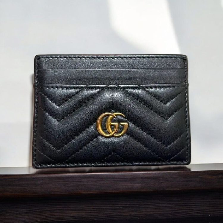 구찌 정품 마몽 마몬트 마틀라세 가죽카드케이스 카드지갑 블랙 팝니다 구찌 정품 마몽 마몬트 마틀라세 가죽 카드케이스 카드지갑 블랙은 구찌의 시그니처 GG 마몽 컬렉션에서 나온 아이템으로, 블랙 마틀라세 쉐브론 레더에 중앙 골드 톤 더블 G 로고가 돋보이는 세련된 카드지갑입니다. 상태 좋아요 전면과 후면 모두 퀼팅 패턴이 일관되게 들어가 있어 어떤 각도에서 보셔도 균일한 고급스러움을 느끼실 수 있으며, 뒷면에는 GG 스티치 디테일이 은은하게 새겨져 있습니다. 내부는 총 5개의 카드 슬롯과 오픈 포켓, 지퍼 포켓 1개로 구성되어 카드뿐만 아니라 소액 현금이나 영수증도 편리하게 관리하실 수 있습니다. 슬림한 사이즈로 포켓이나 미니백에 부담 없이 들어가며, 앤틱 골드 톤 하드웨어가 전체적으로 조화를 이룹니다. 부드러운 마틀라세 가죽 소재 덕분에 손에 쥐었을 때 편안한 그립감을 주고, 캐주얼부터 세미 포멀 룩까지 폭넓게 매치하시기 좋습니다. 20만