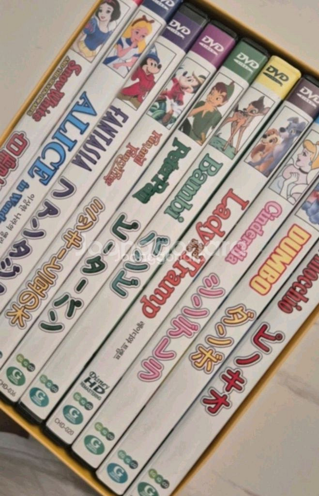 아이들이 좋아하는 영어동화 DVD 8권 세트예요. 케이스 상태도 깔끔하고 아이 영어 학습용으로 좋을 것 같아요. 영어 동화를 좋아하는 아이에게 추천해요!디즈니 HD Remastering DVD 박스 세트입니다 - 백설공주 - 이상한 나라의 앨리스 - 판타지아 - 미키와 콩나무 - 피터팬 - 밤비 - 레이디와 트램프 - 신데렐라 - 덤보 - 피노키오 박스에 담겨 있습니다 영어 일본어까지 나오는 디즈니 DVD 세트입니다 아이들이 좋아하는 디즈니 명작들을 모아놨어요 영어 일본어 자막 오디오 됩니다. 외국어나오면서 한국자막도 설정되고요. 한두번봐서 깨끗해요