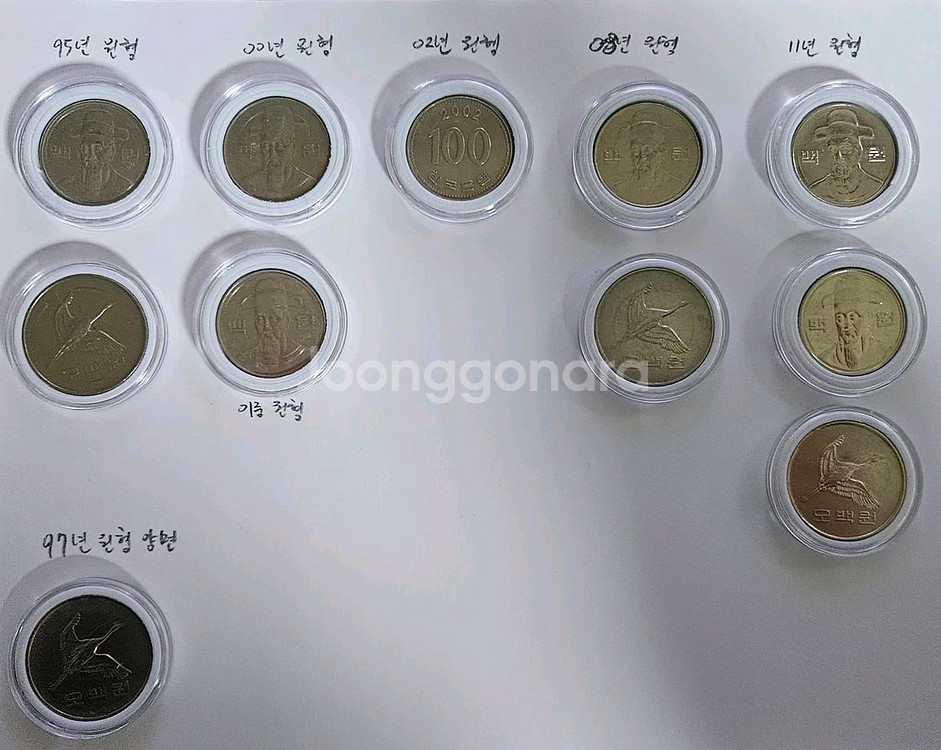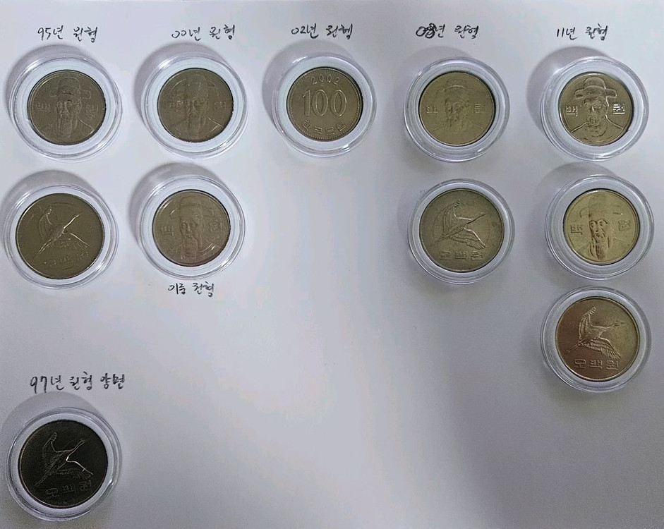 100원 7개, 500원 4개 원형에러 주화 팝니다. 각 년도 100원 95년 1.0 00년 (원형 1, 이중1) 1.0 // 2.0 02년 1.0 08년 1 0 11년 1.0 500원 95년 1 97년 (양면 원형에러) 3.0 08년 1 11년 1 모두 사용제이며 사진 참고해주세요 개당도 판매합니다. 문의 주세요