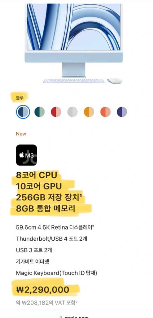 ✔️모델명: Apple 2023 아이맥 24 M3 블루색상 ✔️구매시기: 2023년 말 ✔️사용기간: 거의 사용 안함(넷플 감상용) ✔️구성품: 풀박스(본체, 키보드, 마두스, 케이블, 박스) ✔️상태: 좋은 ⭐️판매가격: 1,500,000 영상 감상용으로만 사용해서 상태 매우 좋으며, 거래는 직접 와주셔야 해요!(강서구청 근처)