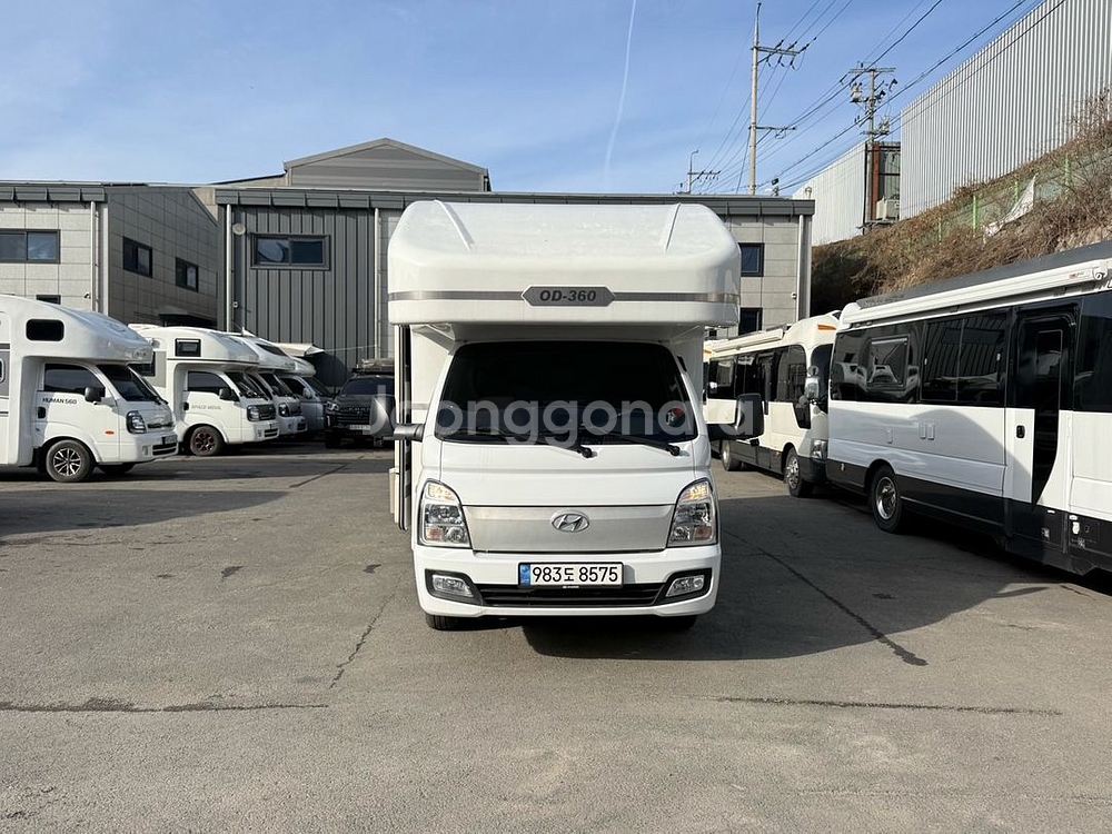 현대 포터2캠핑카 오디360 모델로 깔끔한 화이트 컬러 22년 1만키로 5인승 모델 인산철 900a 바닥난방 온수 히터 고정식변기 풀옵션모델