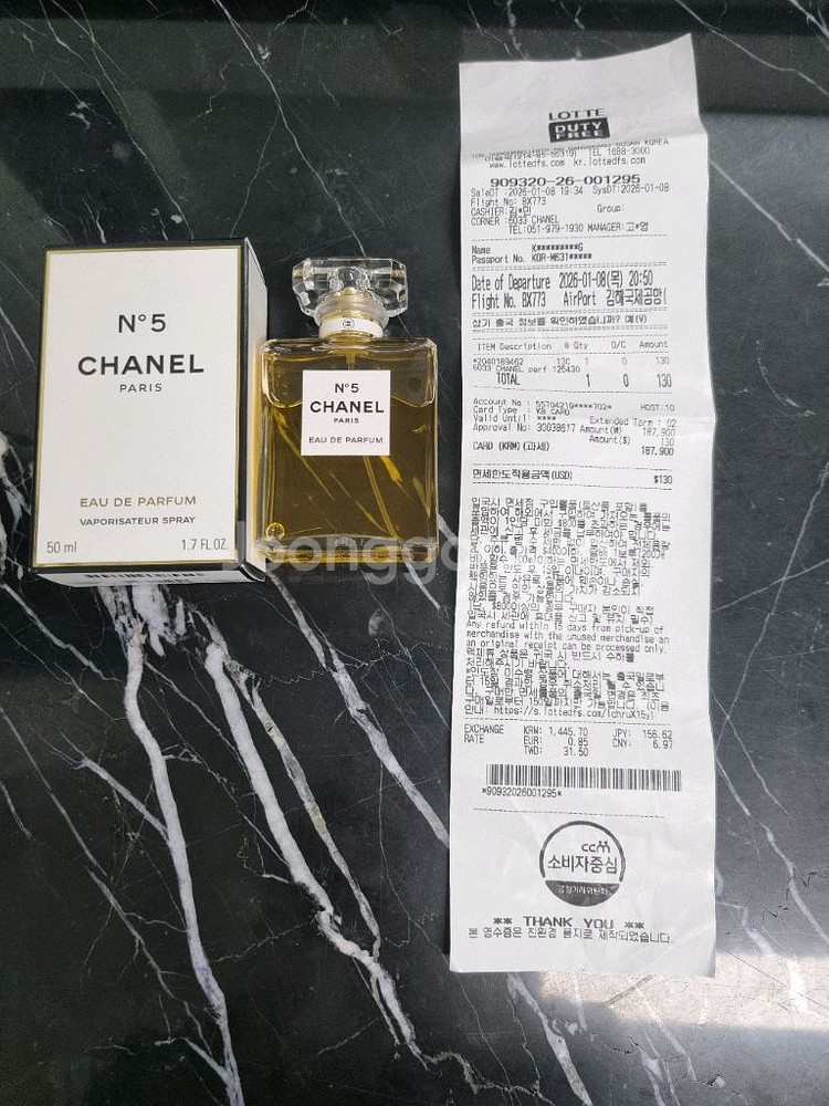 개인정보(거래정보)를 주고받는 행위는 사기에 노출될 수 있으므로 즉시 중고나라로 신고해 주세요샤넬 N5 오드퍼퓸 50ml 정품입니다. 영수증도 함께 있어서 정품 인증 가능 2026-01-08김해공항 면세구입 1회사용 택포15만