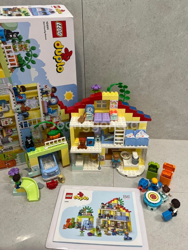 레고 듀플로 10994 3in1 가족의 집입니다 아이들이 좋아하는 레고 듀플로 제품으로, 3가지 모델로 조립이 가능합니다 설명서와 박스 모두 포함되어 있습니다 전체적으로 깨끗합니다만 예민하신 분은 피해주세요