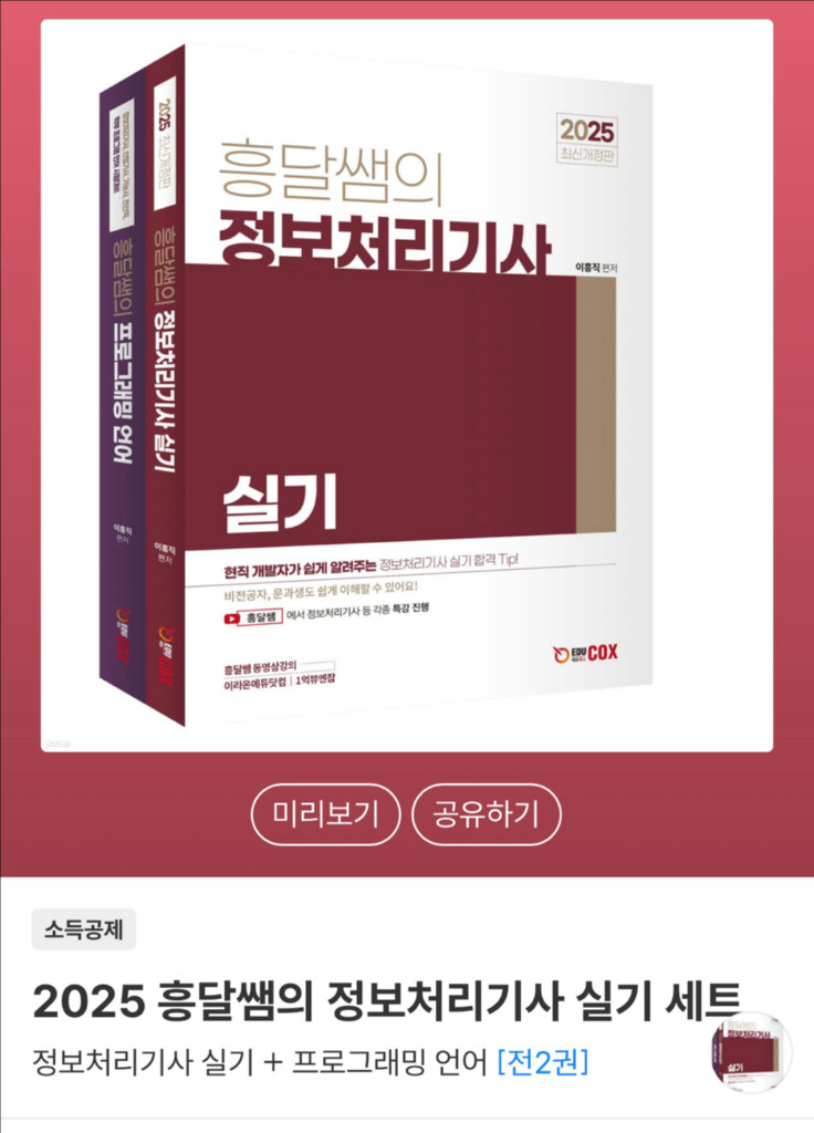 개인정보(거래정보)를 주고받는 행위는 사기에 노출될 수 있으므로 즉시 중고나라로 신고해 주세요2025년 정보처리기사 실기와 프로그래밍 언어 교재 2권 세트예요. 필기 하나도 안하고 아이패드에 문제 풀어 새책 상태로 깨끗하고 상태 좋습니다! 원하시면 사진 보내드립니다! 해가 지나 싸게 판매합니다!!