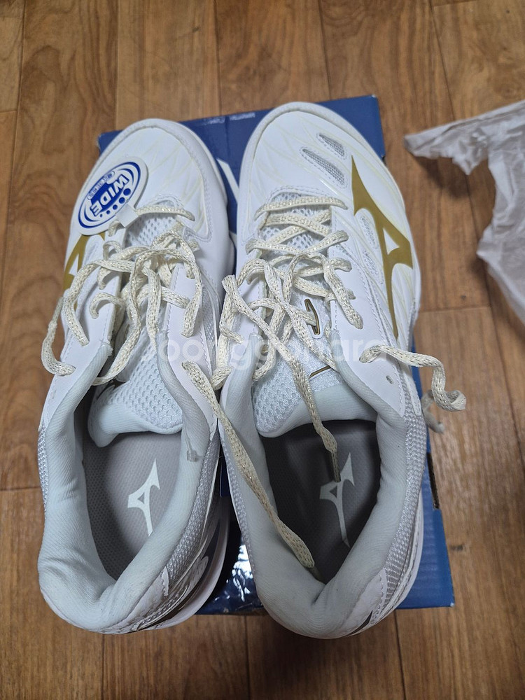 새상품 배드민턴화입니다. 화이트 베이스에 골드 포인트가 깔끔하고 세련된 디자인이에요. 박스와 함께 완전 새 제품 상태로 판매합니다!