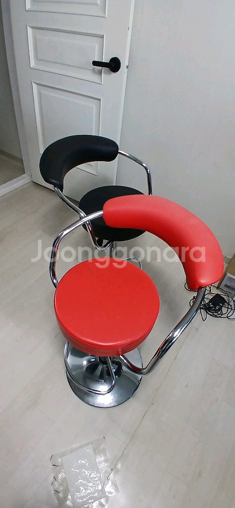 회전식 스툴 의자입니다 빨간색과 검은색 두 가지 색상이 있습니다 크롬 도금된 프레임과 인조 가죽 시트가 특징입니다 높이 조절이 가능합니다 약간의 사용감이 있습니다 개당 8,000원, 두개 다 구매 시에는 15,000원에 드립니다