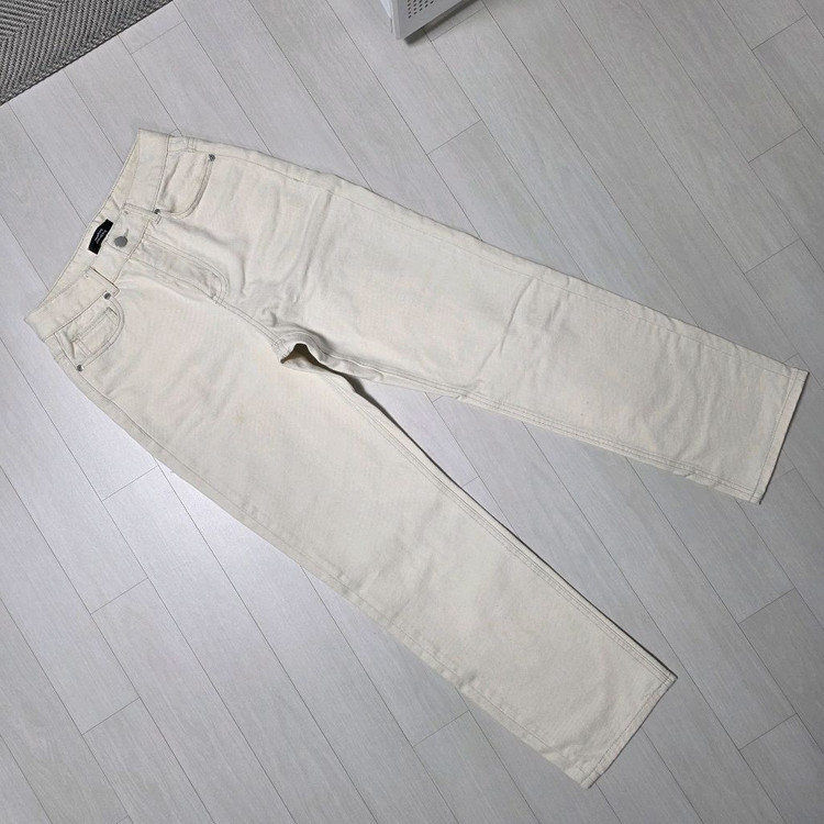 품명: 무신사 스탠다드 레귤러 핏 데님 팬츠 색상: 크림 사이즈: 26 구매일: 2024.01.10 상태: 4회 착용 후 중성세제 세탁, 보관 중 왼쪽 허벅지 부분 희미한 오염