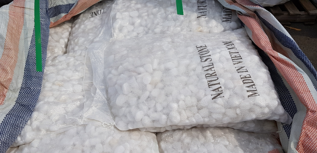 백자갈 30mm / 50mm 1톤 (20Kgx50포) 약 3.5평 시공 가능 010-2708-0707 택배발송 가능합니다. 택배비 12만원 전화주시면 운임조회 해드리겠습니다. 백자갈, 흑자갈 다양한 크기 자갈 있습니다.