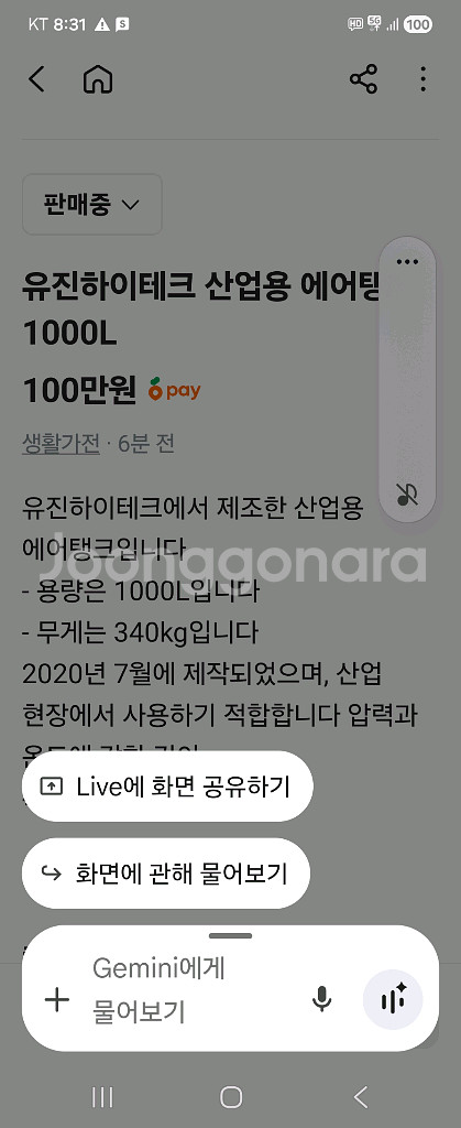 유진하이테크에서 제조한 산업용 에어탱크입니다. 용량 1000L이고 압력게이지가 달려있어 안전하게 사용할 수 있어요. 상태 양호한 중고 제품입니다.