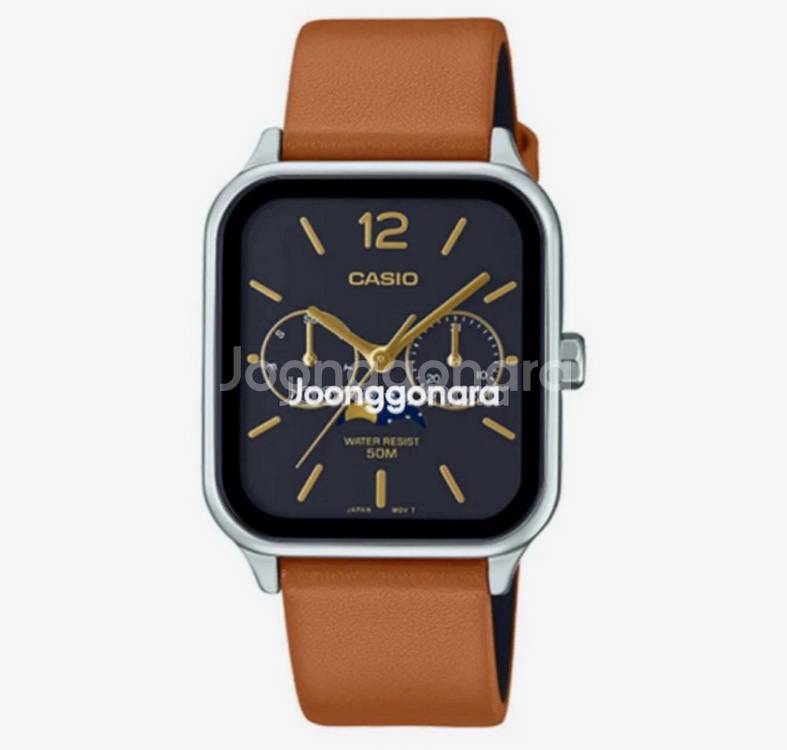 카시오 정품 여성용 시계로 브라운 가죽 스트랩과 네이비 다이얼이 세련된 디자인이에요. 깔끔한 상태로 보이며 일상 착용하기 좋을 것 같아요.