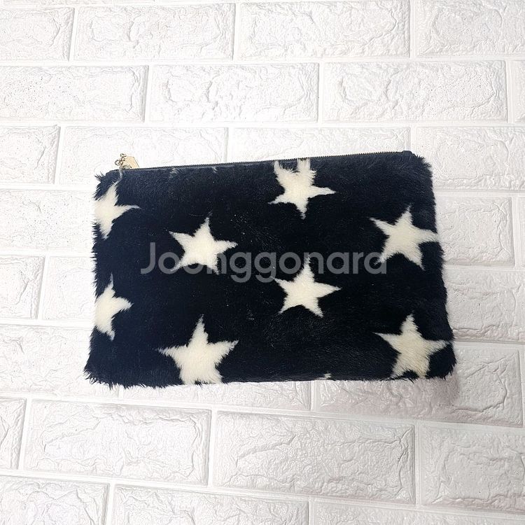 블랙 앤 화이트 컬러의 귀여운 별 패턴 클러치입니다. 부드러운 퍼 소재로 되어있어 따뜻한 느낌을 줍니다. 가볍게 들고 다니기 좋은 사이즈입니다. 상태양호합니다 가로 35 세로 23 반품환불 안대요 신중구매주세요