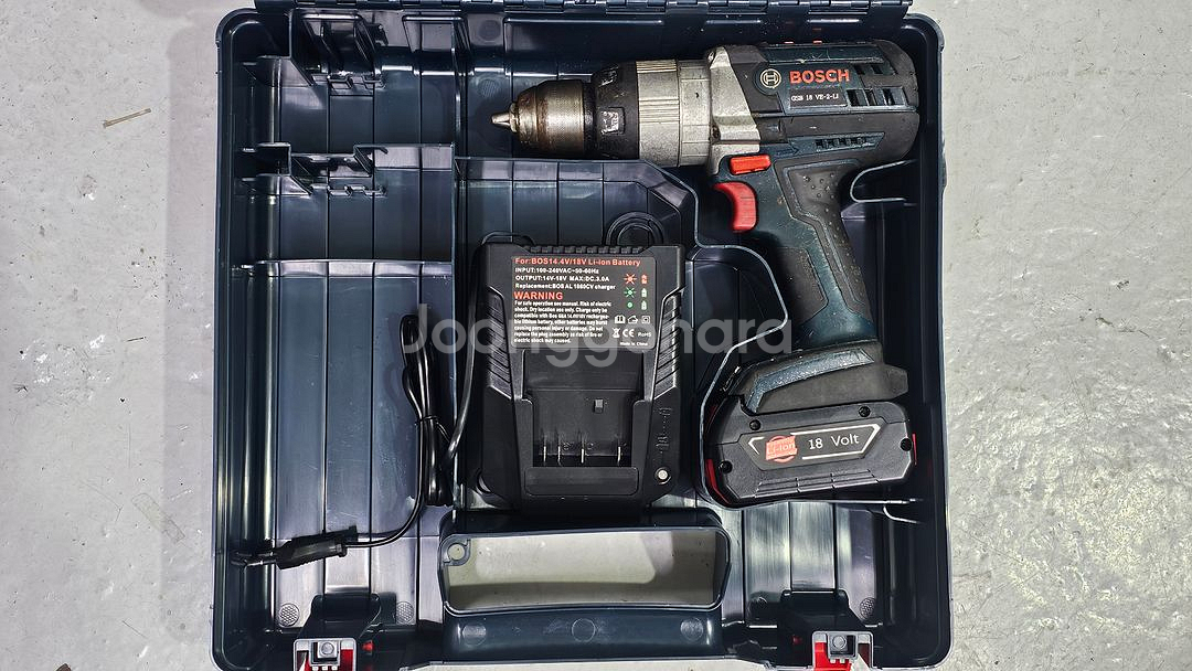 보쉬 앙키 드릴 GSB 18 VE 2 LI 충전 드릴 세트입니다. 케이스와 배터리가 포함되어 있고, 사용감은 있지만 작동 상태 양호해요. 전문 작업용으로 힘 좋고 앙카 작업 가능합니다