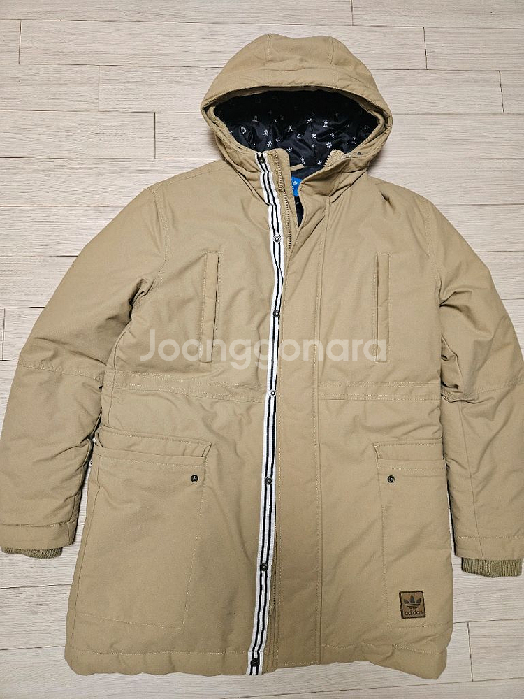 아디다스 패딩점퍼 95, 105사이즈예요. 베이지 컬러에 후드가 있고 안감은 블랙으로 되어있어요.커플로 사놓고 몇번 입지 않아서 상태 양호하고 깨끗합니다.