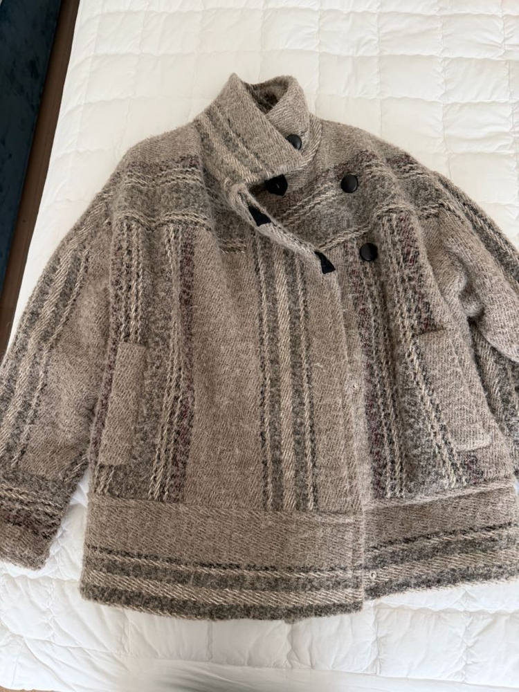 34사이즈고 오버핏이에요! 영국에서 구매했습니다. 꺼끌꺼끌한 재질이에요.
