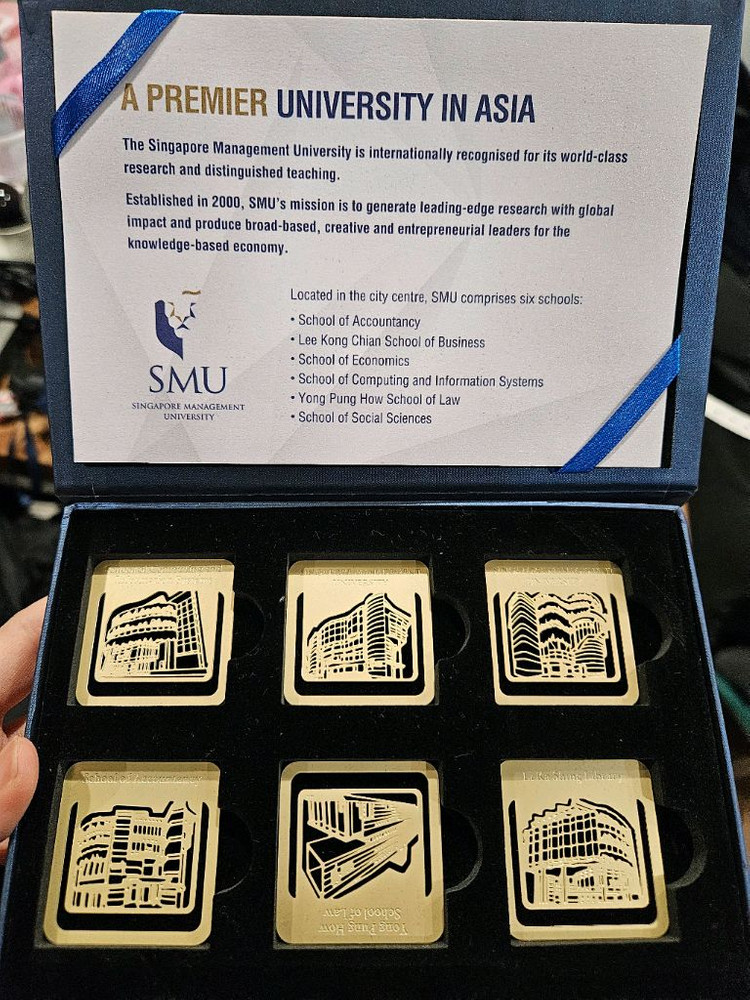 싱가포르 Singapore Management University(SMU) 공식 기념 메탈 소품 세트입니다. ✔ 해외 대학 기념품 ✔ 금색 메탈 재질 (순금 아님) ✔ 인테리어 소품 / 북마크 / 수집용으로 적합 ✔ 케이스 포함, 상태 매우 양호 장식용으로 예쁘고, 해외 대학 굿즈 수집하시는 분께 추천드려요. 택배 거래 가능 / 직거래도 가능