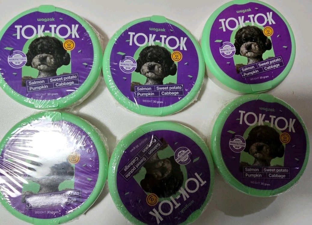 wagzak 톡톡 강아지 미니트릿입니다 - 연어, 단호박, 양배추 맛 - 30g - 소비기한: 27년 2월 16일까지 총 6개입니다 5개새제품 1개는 개봉만했어요