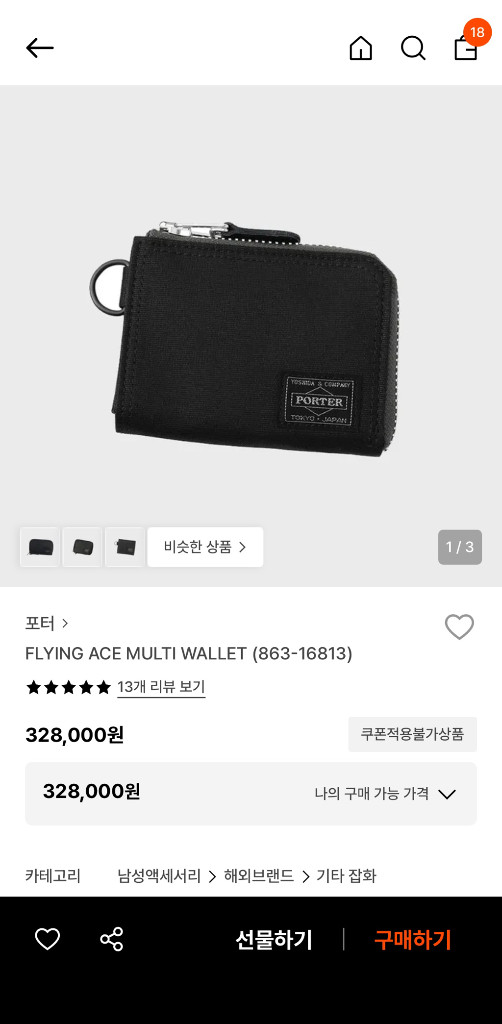 포터 멀티 카드지갑이에요. 블랙 컬러로 깔끔하고 실용적인 디자인입니다. 상태 매우 좋습니다!