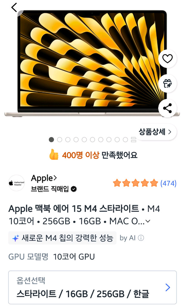 개인정보(거래정보)를 주고받는 행위는 사기에 노출될 수 있으므로 즉시 중고나라로 신고해 주세요모델명맥북 에어 15 M4 16G 256G컬러스타라이트미개봉 새제품 맥북에어 M4 칩셋 모델이에요. 15인치 대화면에 16GB 메모리와 256GB 저장공간으로 구성되어 있습니다. 완전 새 제품 상태로 박스 포장 그대로 판매해요! 미개봉입니다