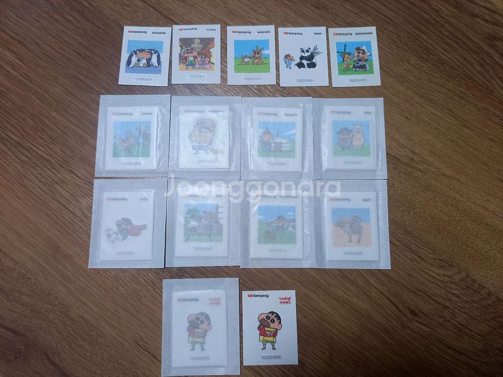 짱구씰 입니다. 세계여행 단종된 시리즈 입니다. 개당 3천원 럭키짱구는 1만5천원 입니다. 개봉,미개봉 가격은 동일합니다. 일반택배 4천원, gs25반값택배 2천원 추가 있어요. 예약,반품,네고는 사양합니다.