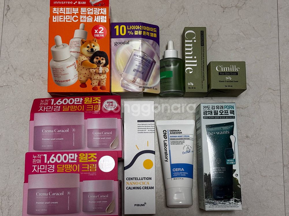 각 1회 사용 - 이니스프리 비타씨 그린티 엔자임 잡티 토닝 세럼 이엑스 캡슐세럼 1개만 사용 280826까지 20000원 - 구달 청귤 비타씨 흔적앰플 280316까지20000원 - 비건이펙트 청보리 징크 세럼 290430 8000원 - 씨 밀레 허브 수딩 세럼 280616 15000원 - 씨 밀레 퓨어 캄 크림 280526 15000원 (세럼, 크림 일괄 구매 시 28000원) - 자민경 크레마카라콜 오리지날 프리미어 달팽이크림 1개사용2개세트 280924 (10000원) 미사용2개세트 15000원 - 피부미 센텔루션 나노 시카 카밍 크림 280717 10000원 - CNP 더마앤서 베리어 리셋 크림 280205 15000원 - 비원츠 씨위드 피디알엔 글로우 필 오프 270723 10000원