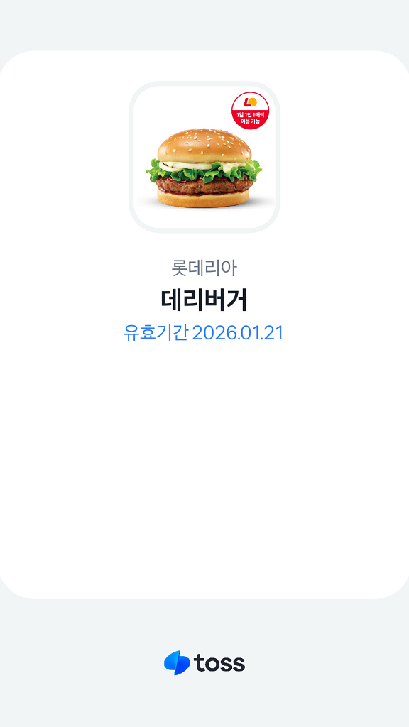 개인정보(거래정보)를 주고받는 행위는 사기에 노출될 수 있으므로 즉시 중고나라로 신고해 주세요롯데리아 데리버거 기프티콘이에요. 유효기간이 2026년 1월 21일까지라서 빠른 거래 원해요!