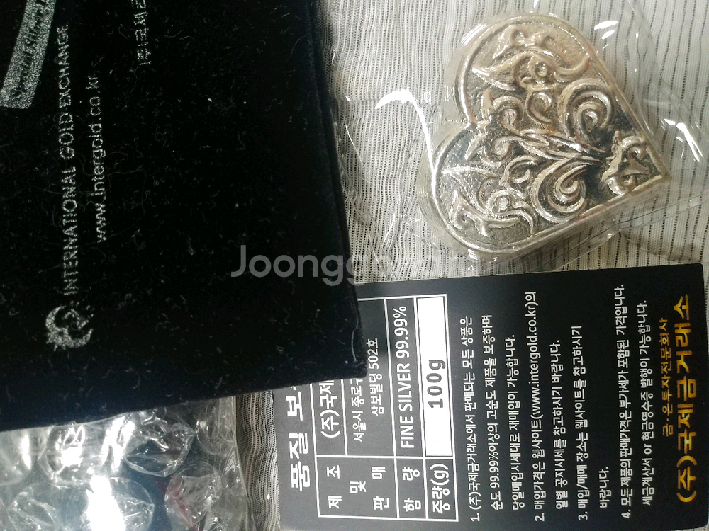 국제금거래소에서 발행한 순은 99.99% 심포니바 100g입니다. 하트 모양의 예쁜 디자인으로 포장 상태 양호해요. 투자용이나 선물용으로 좋을 것 같아요!서청주우체국안 현금거래만요ㆍ네고 택배사절할께요ㆍ