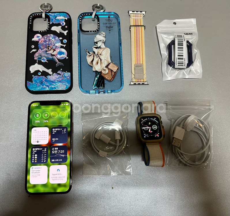아이폰12프로256기가,애플워치5셀룰러44미리,케이스티파이 아이폰12프로 배터리ㅡ79프로 용량 ㅡ256 색상 ㅡ골드 모든기능 정상 상태 ㅡA급 애플워치5 셀룰러 44미리 모든기능 정상 사용감 많음 앞면 옆쪽에 액정 금이갔는데 1년넘게 샤워하고해도.작동 잘됨 (테두리 케이스 끼우면 아예 안보임) 배터리 ㅡ74프로 셀룰러임 케이스 티파이 케이스 2개 새상품 워치 케이스 새상품 워치 스트랩 새상품 라이트닝 케이블 정품 드림