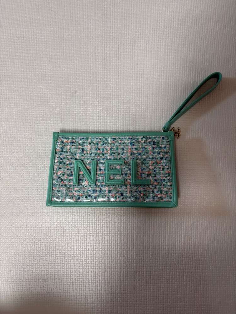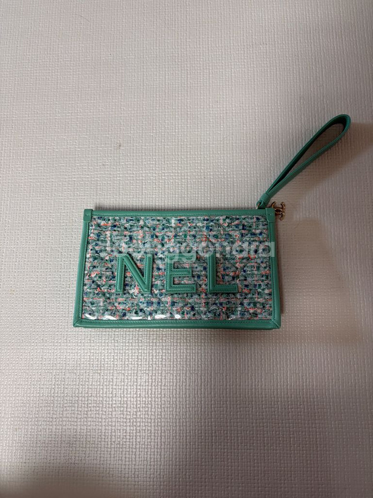 샤넬 브랜드의 민트색 클러치백이에요. 앞면에 CHANEL 로고가 있고 손잡이와 지퍼로 여닫을 수 있어 실용적입니다. 상태 양호한 중고 제품으로 깔끔하게 관리되어 있어요.
