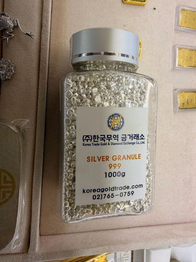 999 순은 실버 그래뉼 1kg입니다. 깔끔한 플라스틱 용기에 포장되어 있고 상태 양호해요. 순은 실버로 투자용이나 선물용으로 좋습니다.