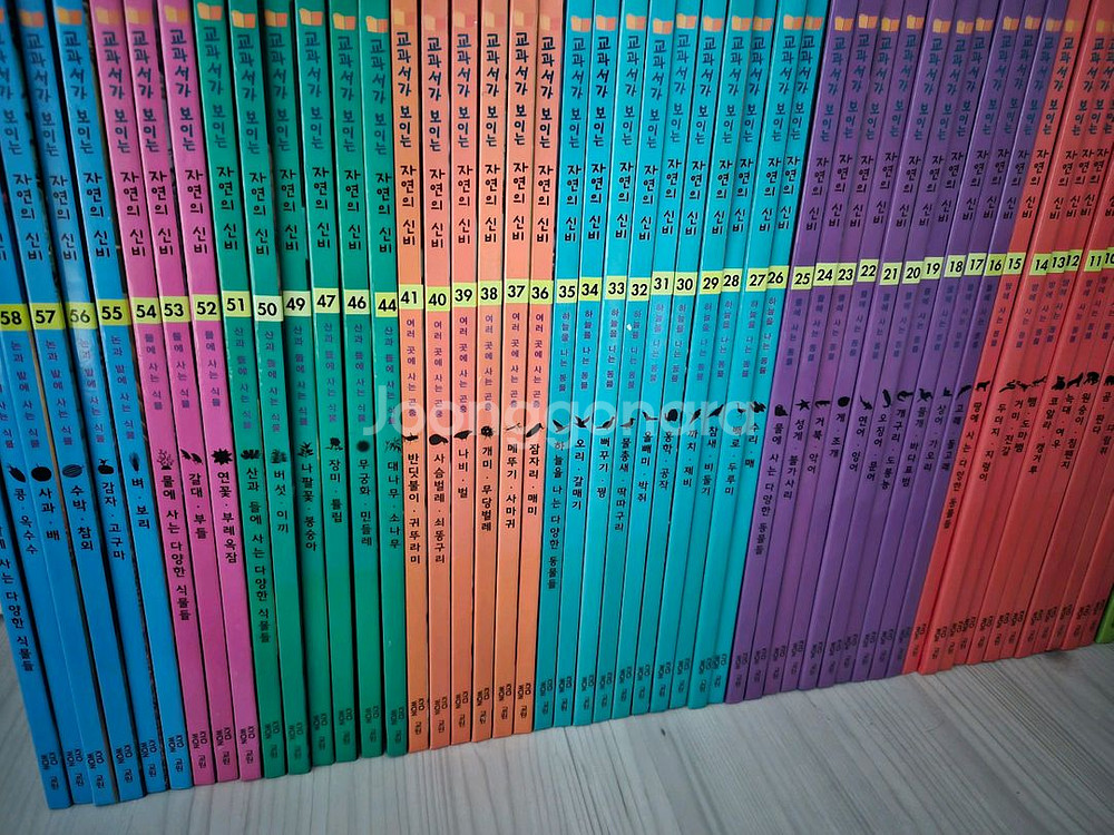 전집 58권 완질이에요. 다양한 색상의 책들로 구성되어 있고, 전체적으로 깔끔한 상태입니다. 아이들 과학 교육용으로 정말 좋은 시리즈예요! 60권 세트인 걸로 알고 있는데 배송될때 58권으로 뒤늦게 배송된 걸 알아서 그냥 58권으로 두었어요. 너무 뒤늦게 사줬는지 사놓고 한번도 읽지도 않고 책상에 자리만 차지하고 있어서 싸게 팝니다. 반품환불불가 택배로 보내드리겠습니다.