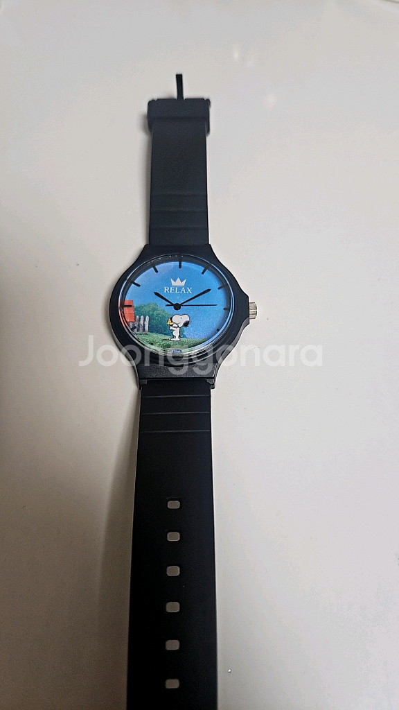 캐릭터가 그려진 블루 다이얼의 시계예요. 블랙 실리콘 스트랩으로 되어있고 상태는 양호해 보입니다.
