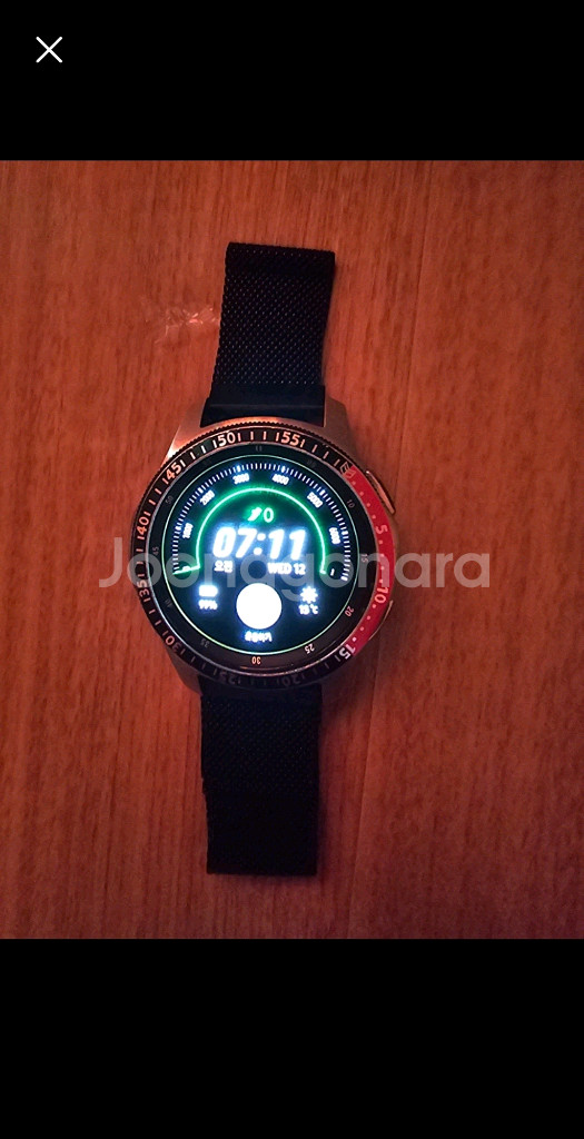 스마트워치입니다. 블랙 실리콘 밴드와 실버 케이스로 깔끔한 디자인이에요. 화면도 선명하고 상태 양호합니다.