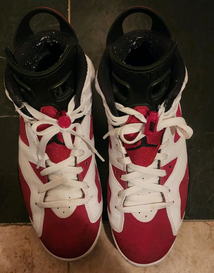 제품 정보 모델명: 에어 조던 6 레트로 카마인 사이즈: 270mm 제품 상태: 중고 (사용감 있음) 상세 설명 조던 시리즈 중 가장 인기 있는 컬러 중 하나인 '카마인'입니다. 실착 목적으로 구매하여 아껴 신었으나, 세월의 흔적과 사용감이 있어 저렴하게 내놓습니다. 외관: 화이트 가죽과 레드 스웨이드 부분에 자연스러운 생활 오염과 주름이 있습니다. 뒷축 및 내부: 사진에서 보시는 것처럼 뒷축 내부 안감 쪽에 보풀 및 쓸림 현상이 있습니다. 특이사항: 실착 5회 미만입니다.
