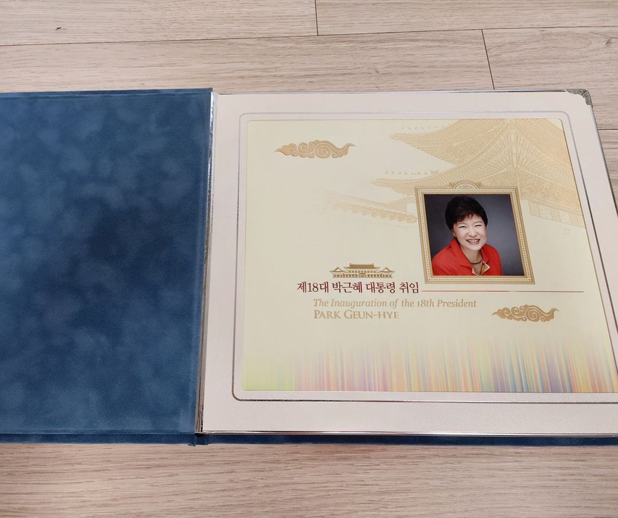 제18대 박근혜 대통령 취임을 기념하는 특별 우표북이에요. 내부에 다양한 기념품들이 포함되어 있고 상태도 깨끗한 편입니다. 역사적 의미가 있는 소장용 아이템으로 좋을 것 같아요.