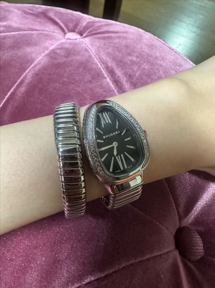정품문의 x 두줄 세르펜티 시계이구요 블랙판입니다. 착용을 별로 하지않아 상태 좋아요 90언저리에 구매했어요 저렴하게 팝니다