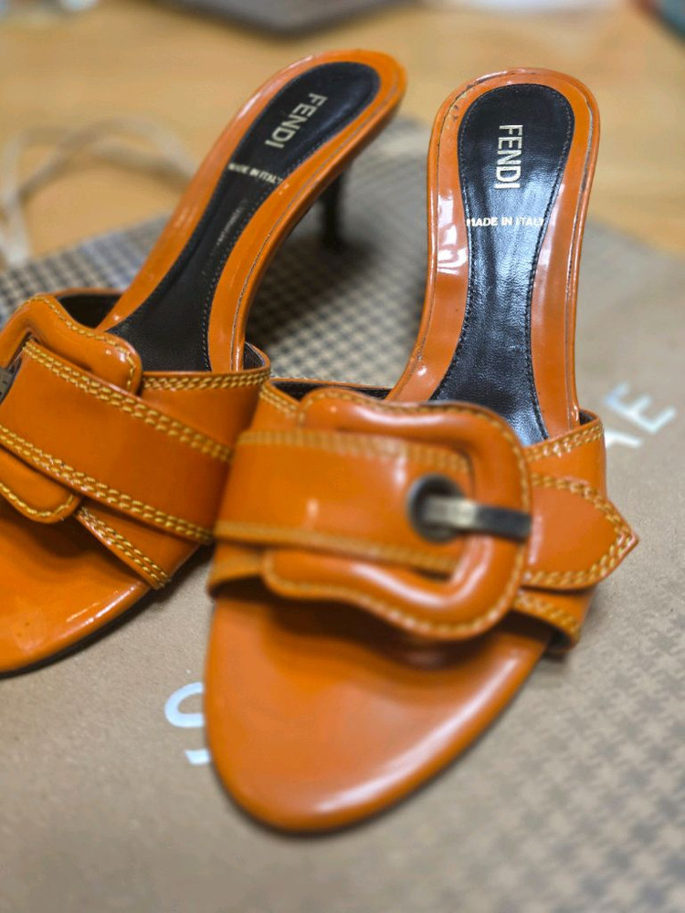 펜디(FENDI) 정품 가죽 뮬 힐입니다. 이태리 생산 제품으로 가죽과 마감 퀄리티 좋아요. 출시 당시 정가 100만 원 넘게 준 제품이며, 현재는 빈티지 제품으로 사용감은 있습니다. 착용에는 문제 없고, 빈티지 감성 좋아하시는 분께 추천드려요. 주황색이 고급스럽고,펜디로고가 보여 너무 이쁩니다. 225~230 권합니다. ✔️ 정품 ✔️ MADE IN ITALY ✔️ 가죽 뮬 힐 📦 택배 가능 ❌ 반품·환불 불가