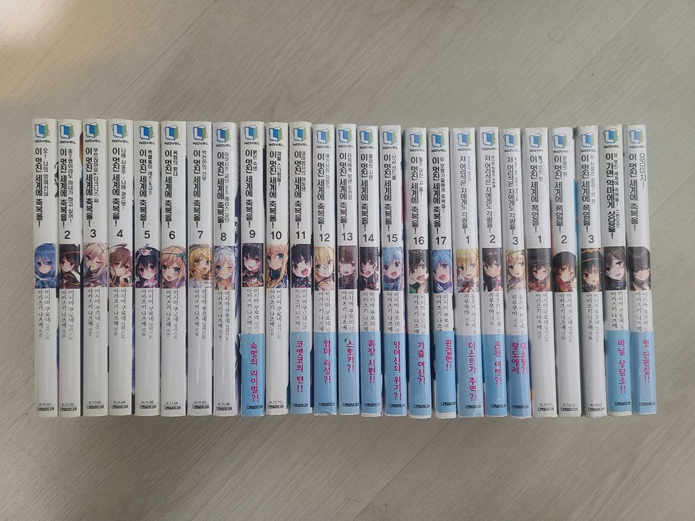 이 멋진 세계에 축복을 1-17 요리미치 저 어리석은 자에게도 각광을 1-3 이 멋진 세계에 폭염을 1-3 이 가면 악마에게 상담을 총 25권 축복 10권 상태 별로임 축복 9,11,17권, 상담 종이책갈피 포함 축복 9권 캐릭터팝 포함 축복 7-8,12-16권 미개봉 요리미치 미개봉 각광 1-3권 미개봉 폭염 1-3권 미개봉 띠지는 몇몇 찢어짐 전반적으로 양호 택배비 별도