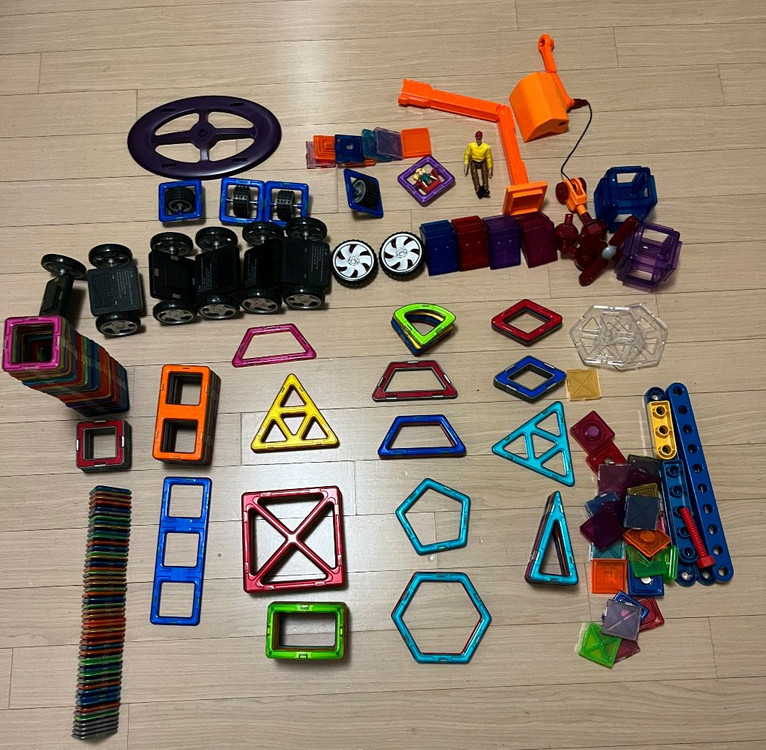 맥포머스 대용량 세트 중 263피스 있습니다. 세번째 사진과같은 다양한 모양과 색상의 블록들로 창의적인 건축과 조합을 할 수 있어서 아이들이 정말 좋아해요. 사용감은 있지만 아직 충분히 활용 가능한 상태입니다.