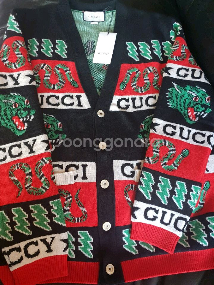 구찌 시그니처 스네이크 패턴과 로고가 들어간 가디건이에요. 새상품 매치스에구입.가격210만원.싸이즈 m싸이즈.100~105 입으시면 맞아요. 두껍고 따뜻합니다.