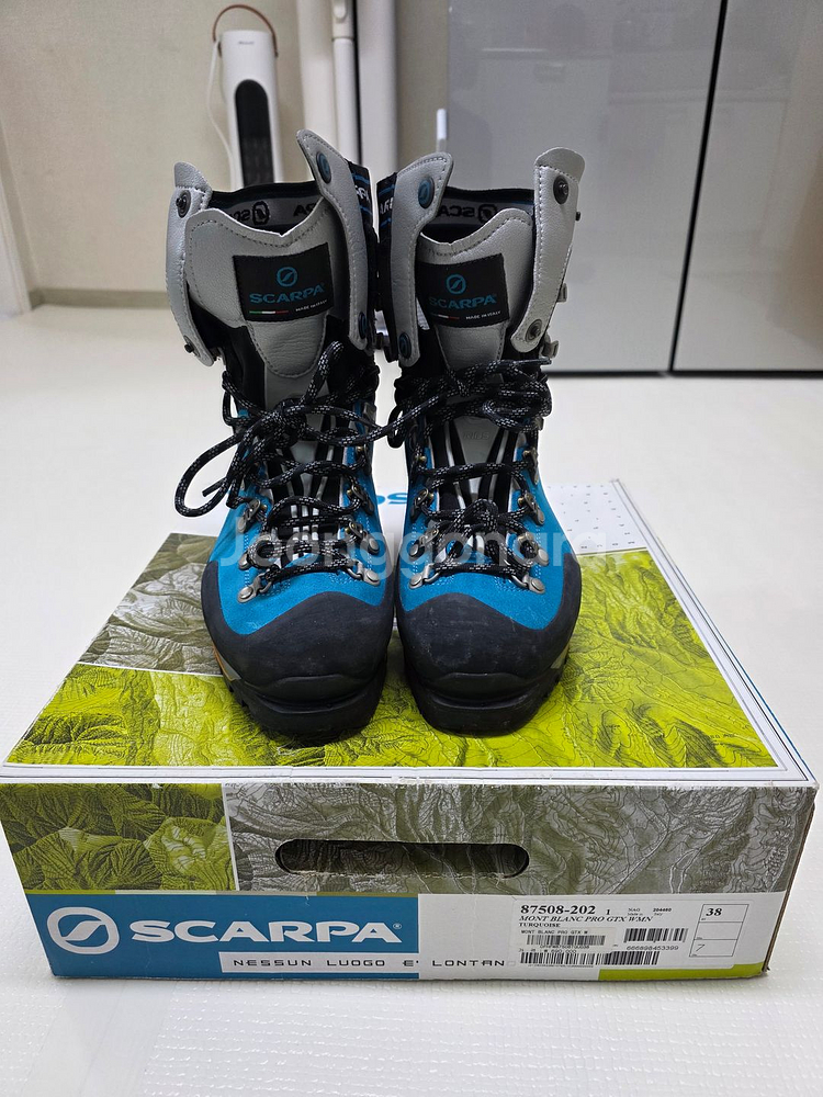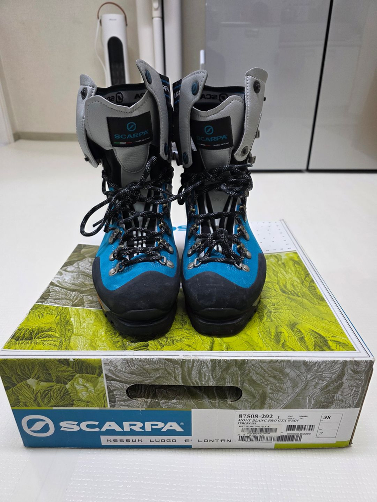 개인정보(거래정보)를 주고받는 행위는 사기에 노출될 수 있으므로 즉시 중고나라로 신고해 주세요스카르파 몬테블랑 프로 등산화입니다. 박스와 함께 판매하며 상태 양호 스카르파 몽블랑 프로 빙벽화 사이즈 38(235) 색상은 블루 사용횟수 : 1회