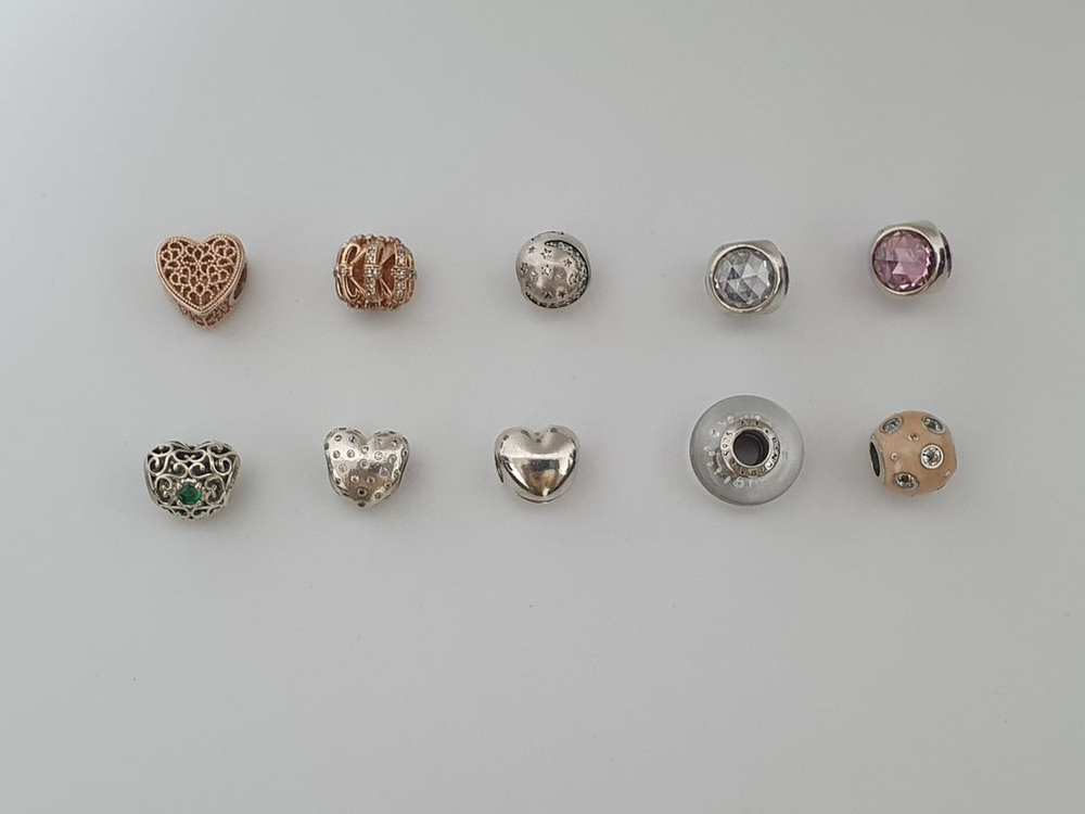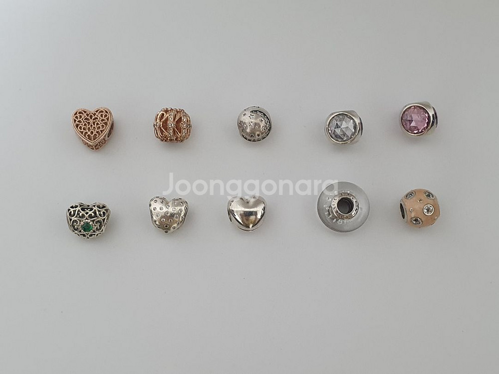 판도라 정품 참이에요. 큐빅 빠짐 없고 각인 다 있고 상태 좋아요~ 각인 사진은 따로 찍어뒀는데 너무 많아서 못 올렸어요. 말씀해주시면 사진 보내드릴게요~ 가격은 한개 30000원이고, 2개 이상 하시면 씨유 반값택포 해드려요. 1. 로즈골드 엔틱 하트 참 2. 로즈골드 리본 라운드 참 3. 실버 달별 클립 참 4. 실버 투명 큐빅 참 5. 실버 핑크 큐빅 참 6. 실버 엔틱 하트 에메랄드 참 7. 실버 큐빅 하트 참 8. 실버 베이직 하트 클립 참 9. 실버 화이트 무라노 참 (각인이 조금 흐려요) 10. 실버 오렌지 큐빅 참 택비는 별도에요. 일반 4000원 반값 2000원 중고인 점 감안하셔서 신중히 구매해 주세요.