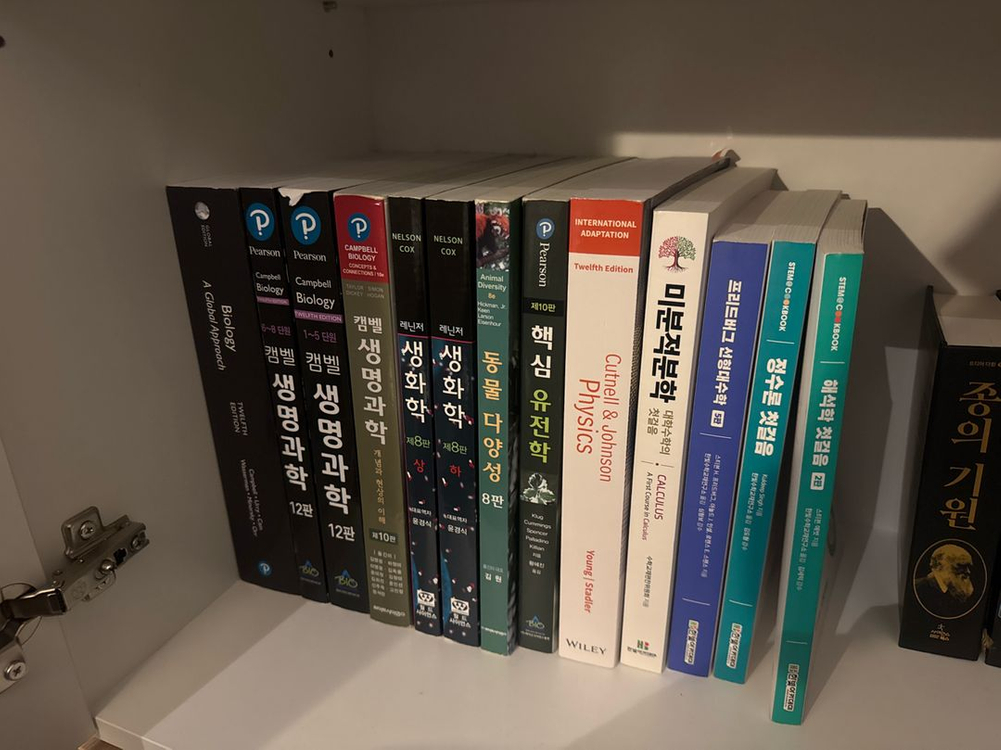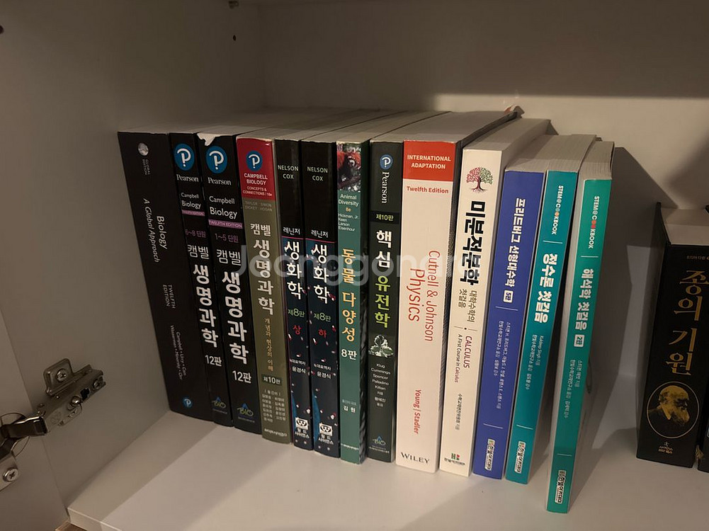 - 미분적분학 2만원 - 선형대수학 2.5만원 - 정수론 2만원 - 해석학 2만원 - 핵심 유전학 2.5만원 - 동물다양성 2.5만원 - 마스터톤 화학교재 1.5만원 - Campbell biology essential 1.5만원 - 생화학 길라잡이 1만원 포장만 벗기고 보관만했습니다 ㅠㅠ 생화학 길라잡이 빼고는 진짜 새책들입니다