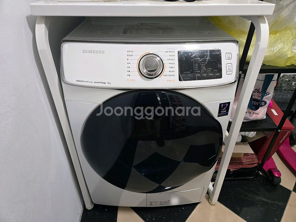 삼성 드럼세탁기 14kg 용량으로 깔끔한 화이트 컬러입니다. 상태 양호하고 정상 작동하는 제품이에요. 삼성 Hybrid HeatPump Smartthings 건조기 14kg입니다 - Hybrid HeatPump 방식으로 옷감 손상 걱정 없이 건조 가능합니다 - Smartthings 앱 연동으로 스마트한 건조 경험을 제공합니다 - 12년 워런티 보장으로 안심하고 사용 가능합니다 6년 정도 사용하였고 세탁기위에 거치 가능한 앵글도 필요시 함께 드립니다. 리모컨 / 사용설명서 등등 부속품들 함께 보관중입니다. 무게가 있어서 용달기사님 섭외하셔서 가져가셔야 합니다~~
